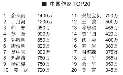 5¡¢ÁíÍ⣬²¿·Ö×÷¼ÒµÄ×÷Æ·ÔÚÓ°ÊÓ¸Ä±à·½Ãæ»ñµÃµÄÀûÈóÒ²ºÜ¿É¹Û£¬±ÈÈ纣ÑÒ¡¢³ØÀò¡¢¶þÔºӵÈÈË£¬µ«Õâ±Ï¾¹ÊôÉÌÒµÃØÃÜ£¬ºÜ¶à×÷¼Ò²»Ô¸Í¸Â¶£¬ËùÒÔÔÚÅÅÃûʱ£¬ÎÒÃǽöÒÔͼÊé°æË°¼ÆËã¡£